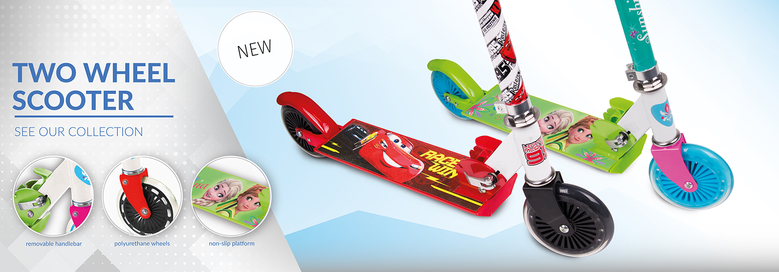 We are pleased to introduce our new children scooters. They're great for outdoor play. The adjustment system make it easy to adjust scooter for a size of the child.