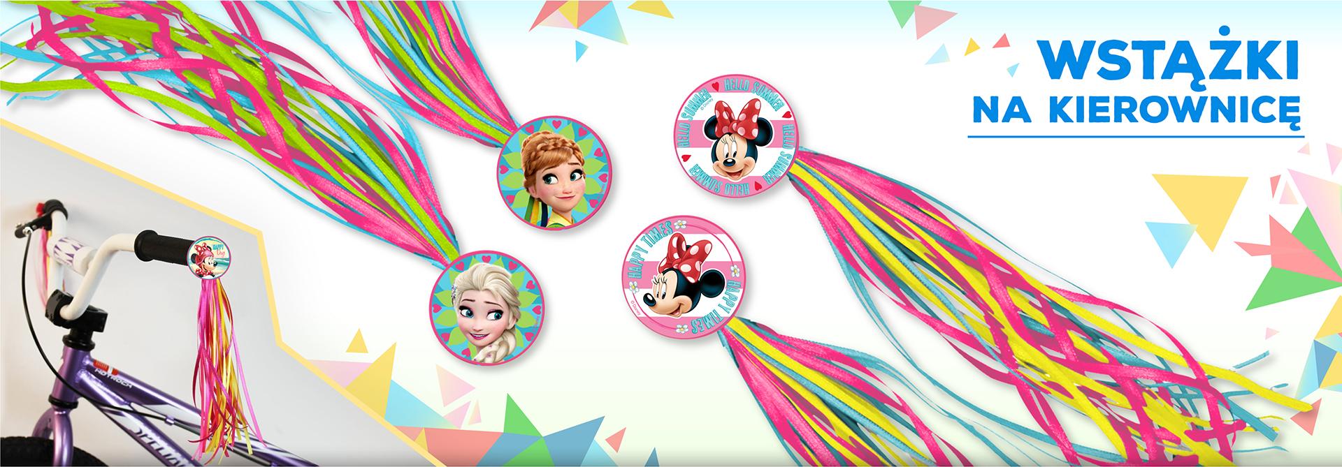 Pragniemy poinformować o nowej dziewczęcej kolekcji wstążek na kierownicę z motywami na licencji Disneya. Kolorowe wstążki będą doskonałą dekoracją zarówno do hulajnogi jak i rowerka dziecięcego.